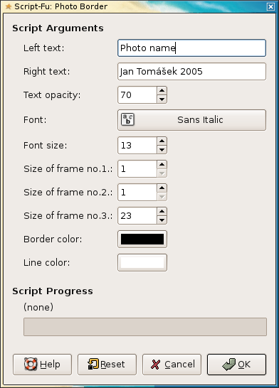 Pokud se Vám tenhle skript bude líbit, tak asi nebudete chtít po každém restartu Gimpu znovu přepisovat "Jan Tomášek 2005". Přednastavené hodnoty jsou uvedeny na konci skriptu. Stačí, když ho otevřete v textovém editoru (gedit, notepad,...) a upravíte hodnoty podle svých představ. Texty jsou snadné, barvy jsou v RGB a jednotlivé kanály mají rozsah 0-255. Tloušťky rámečků definuje první číslo, ostatní čísla se týkají vstupního políčka - nemanipulujte s nimi.