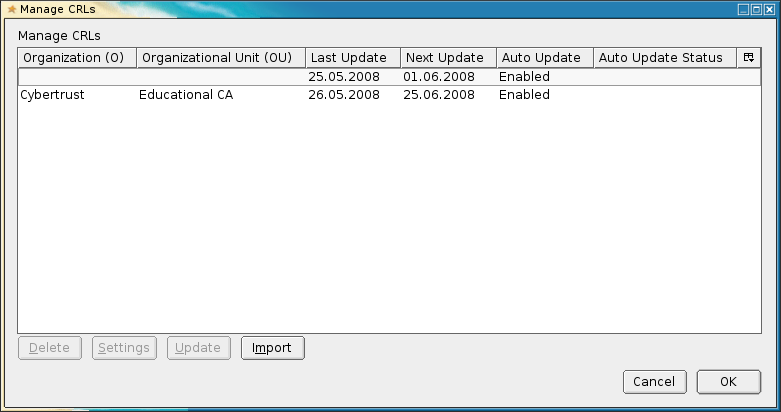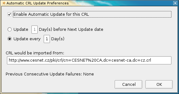 For this setting it is necessary to choose Edit -> Preferences -> Advanced -> Encryption -> Revocation -> Import. This long click path displays a window called "Automatic CRL Update Preferences". It looks nice. I have chosen to update CRLs once a day , that is frequently enough for most cases. I visited this window last time at 26th May 2008, now it is 16th Jun 2008 and Firefox still shows the same content in the window "Manage CRLs". CRLs are not automatically updated at all!