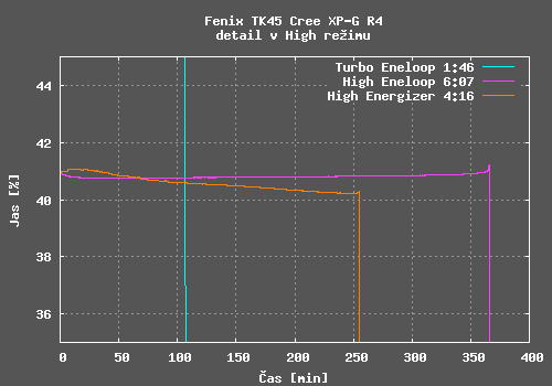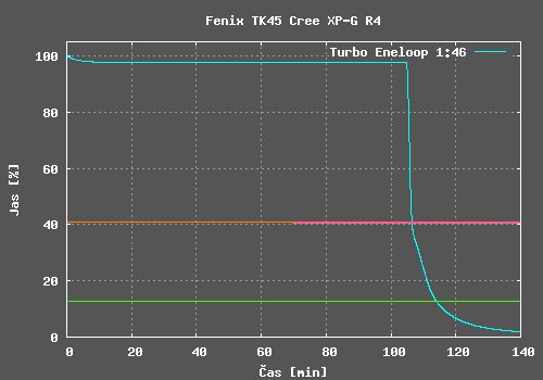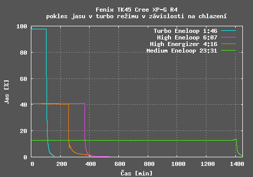 Potěšilo mě, že hodnoty výdrže udávané výrobcem jsou skutečně dosažitelné. Kvalita regulace konstantního jasu je u svítilen Fenix tradičně velmi dobrá a TK45 není výjimkou. V Turbo režimu dochází k poklesu jasu z důvodu zahřání svítilny, velikost poklesu je závislá na chlazení svítilny. V High režimu a Medium režimu jsou i detailní grafy tvořeny v podstatě přímkou.