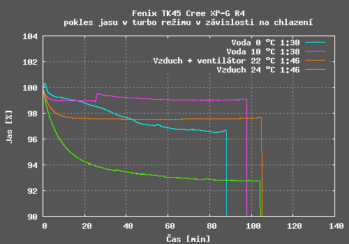 Pokles jasu v Turbo režimu jsem naměřil mezi 1 až 7 %, závisí na kvalitě chlazení. Pro měření ve vodě jsem svítilnu umístil do kýblu s vodou (s reflektory nad hladinou, jinak jsem měl problémy s usazováním bublinek na sklíčkách a následném negativním ovlivnění měření). Vodu o teplotě 0 °C jsem vyrobil z 3 kg ledové drtě zmrzlé na -18 °C a dolité cca 5 l vody. Svítilna rychle rozpustila ledovou tříšť ve svém okolí a postupně začala vodu ohřívat. Voda se bez míchání nezvládala od okolního ledu dostatečně ochlazovat. Zub na křivce pro vodu teplou 10 °C je způsoben tím, že jsem cca 5 min vodu míchal a tím svítilnu lépe chladil.